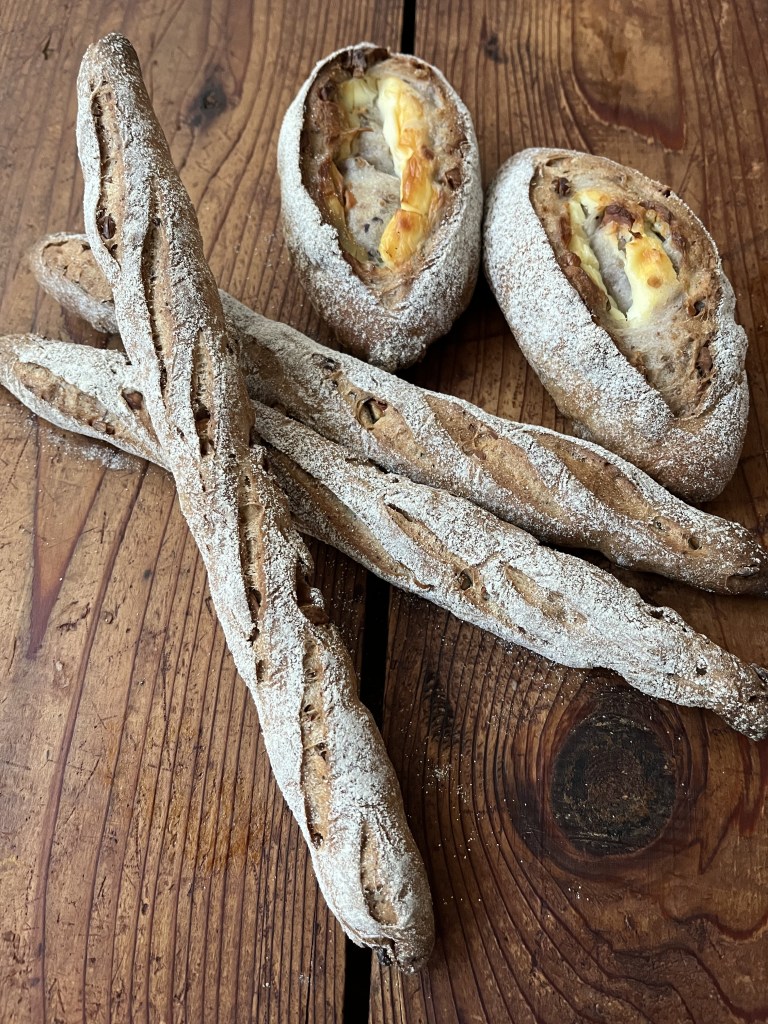 ホシノ丹沢酵母を使い、ライ麦と蜂蜜入りの味わいのある生地に3種類のナッツを混ぜ込み1つは棒状にカリッと仕上げ、もう1つはチーズを包み込んで焼き上げます。レッスンでは分割からの作業となり、生地捏ねについては動画でご説明いたします。