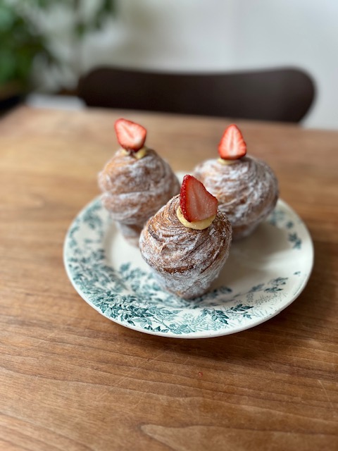 クロワッサンとマフィンをかけ合わせた、外はザクザク、中はしっとりふわふわ食感が絶妙なアメリカ生まれのスイーツパン、クラフィン。ホシノ丹沢酵母を使ったクロワッサン生地で苺×クリームとシナモンシュガーの2種類作ります。レッスンでは生地にバターを折り込む工程からの作業となり、生地捏ねは動画でご説明いたします。