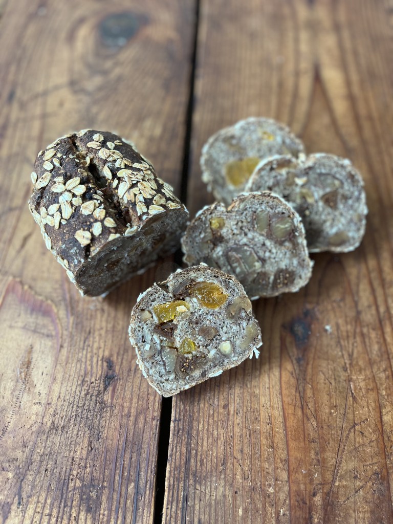 ホシノ丹沢酵母を使ったライ麦生地に雑穀、ナッツ、ドライフルーツ、栗を加えて型に入れて焼き上げます。どっしりと中身が詰まっているので、スライスしてお召し上がりください。レッスンでは成型からの作業となり、生地捏ねについては動画でご説明いたします。