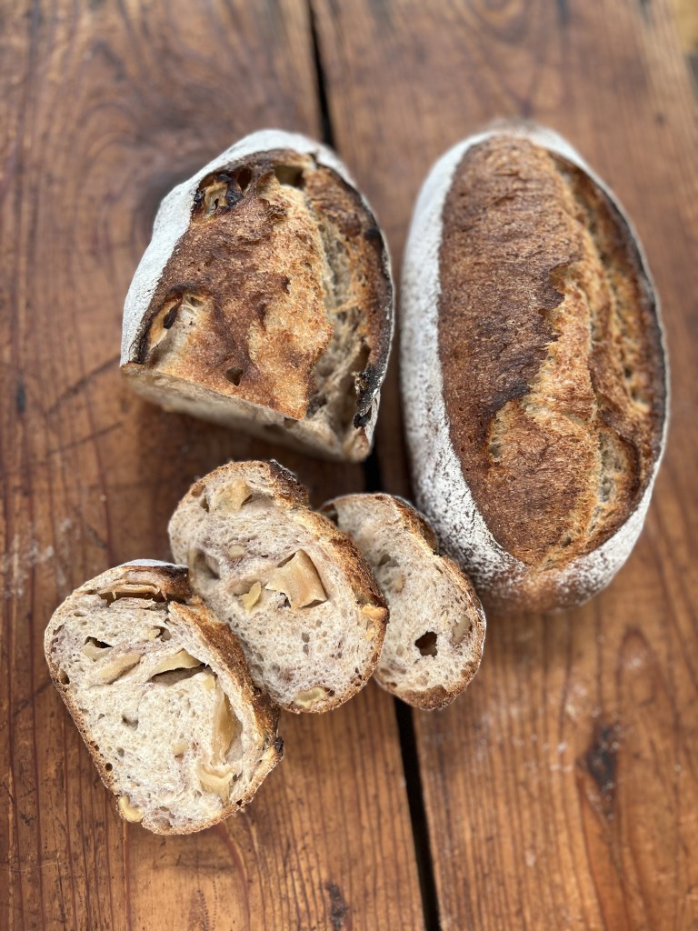 ホシノ丹沢酵母を使用した、ライ麦の湯種入りもっちりカンパーニュ生地にセミドライの紅玉林檎とロースト胡桃を加えました。甘すぎないのでお食事のお供にも◎レッスンでは成型からの作業となり、生地捏ねについては動画でご説明いたします。