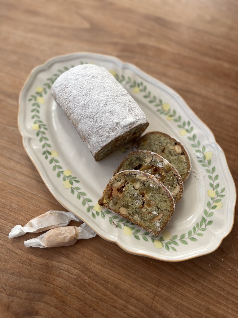 ホシノ丹沢酵母を使い、バターリッチな生地にアールグレイの紅茶葉とほんのりスパイスをきかせ、洋酒漬け自家製柑橘ピール(文旦、清美オレンジ、伊予柑)とカシューナッツを混ぜ、アクセントに手作りの塩キャラメルを巻き込みしっとりと焼き上げます。生地作りから焼き上げまでお一人で一からの作業となります。