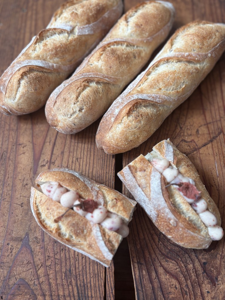 ホシノ丹沢酵母を使い、桜花を生地に練り込んだフランスパンを作ります。ほんのり塩味の効いた桜風味のフランスパン。2本作るうちの1本は甘酸っぱいベリークリームをサンドします。レッスンでは生地の分割からスタートして、生地作りは動画でご説明いたします。