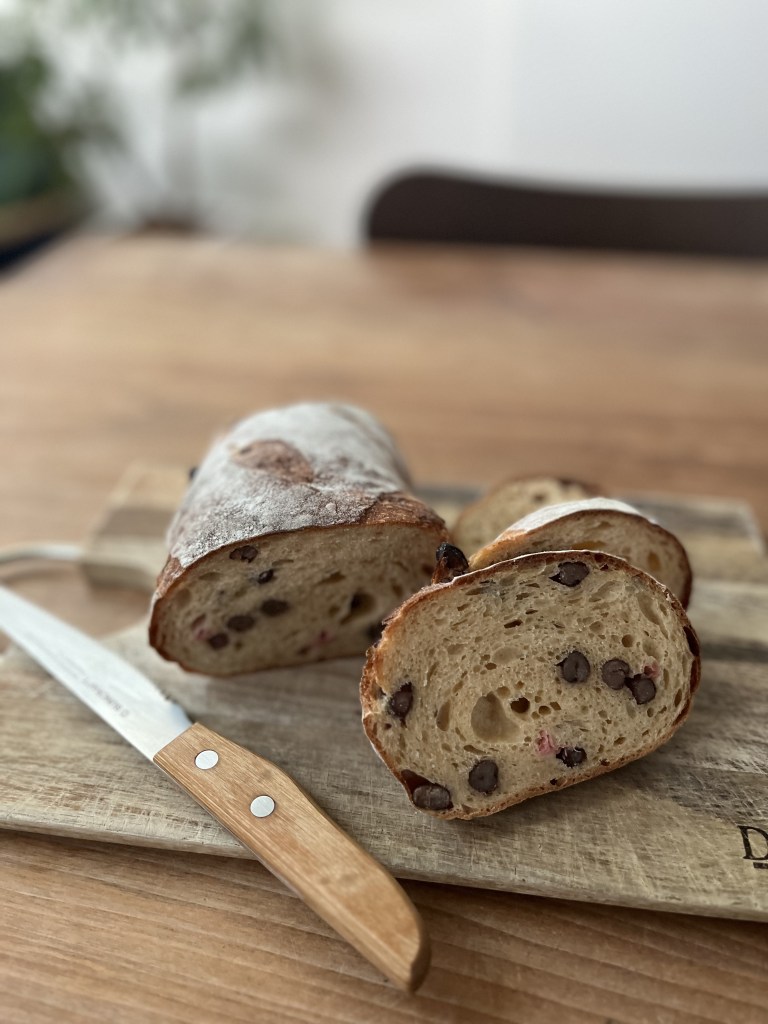 ホシノ丹沢酵母を使い、粉の一部にきな粉を加えて香ばしさを出し、高加水にすることでもちもちとした食感に仕上げました。鹿の子豆と桜の花の塩漬けを加えて甘塩っぱさも。レッスンでは分割からの作業となり、生地捏ねについては動画でご説明いたします。