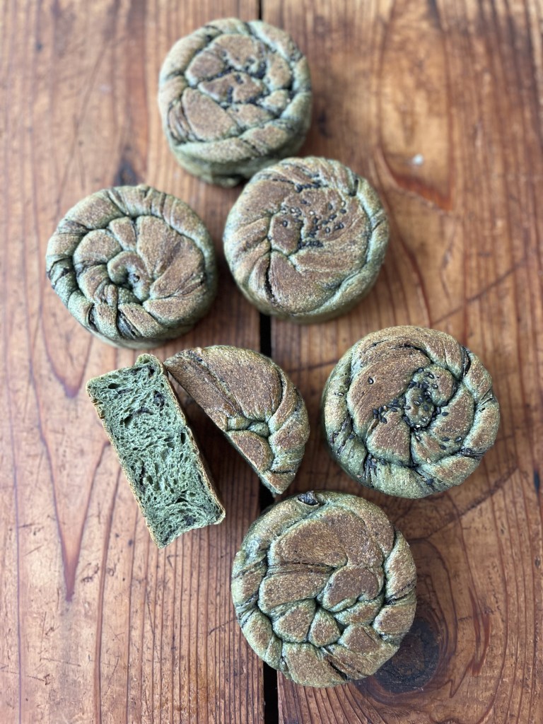 ホシノ丹沢酵母を使い、ヨモギ風味の生地に黒ごまペーストを巻き込み型に入れてしっとりと焼き上げます。シンプルに餡子を包んでヨモギ餡パンを作っても美味しい生地です。レッスンでは分割からの作業となり、生地捏ねについては動画でご説明いたします。