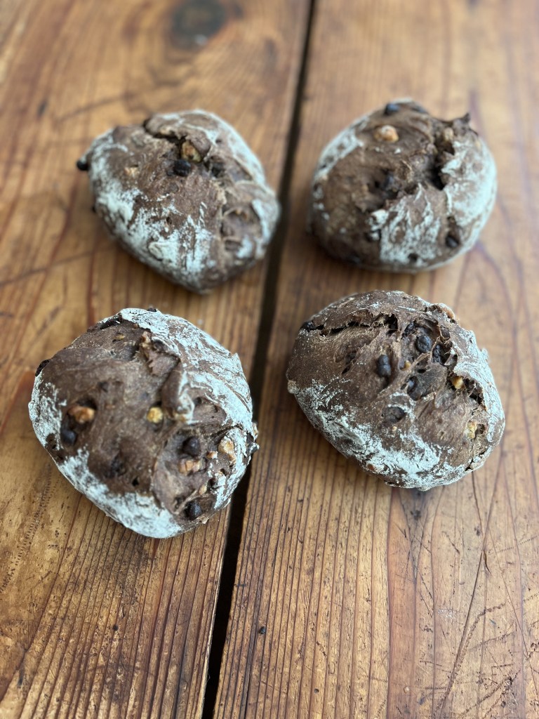 ホシノ丹沢酵母を使い、粉にエスプレッソ用コーヒー豆の粉末とカカオパウダーを加えた深みのあるほろ苦生地にたっぷりのローストクルミと甘さのアクセントにチョコチップを加えた甘すぎないハードパンを作ります。レッスンでは分割からの作業となり、生地捏ねについては動画でご説明いたします。