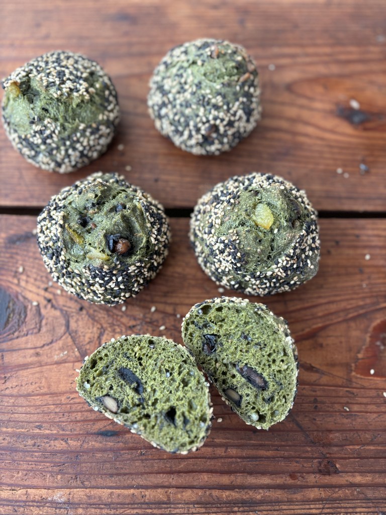 フルーツ酵母を使用した抹茶生地に雑穀と黒豆かのこ、柑橘ピールを加え、食感のアクセントに胡麻をまぶして焼き上げます。炊いた雑穀を生地に混ぜることで、リベイクしなくてもしっとりモチモチ感が保たれるお抹茶パンになりました。今回は和風の具材と合わせますが、チョコやドライフルーツとも相性◎です。レッスンでは分割からの作業となり、生地捏ねは動画でご説明いたします。