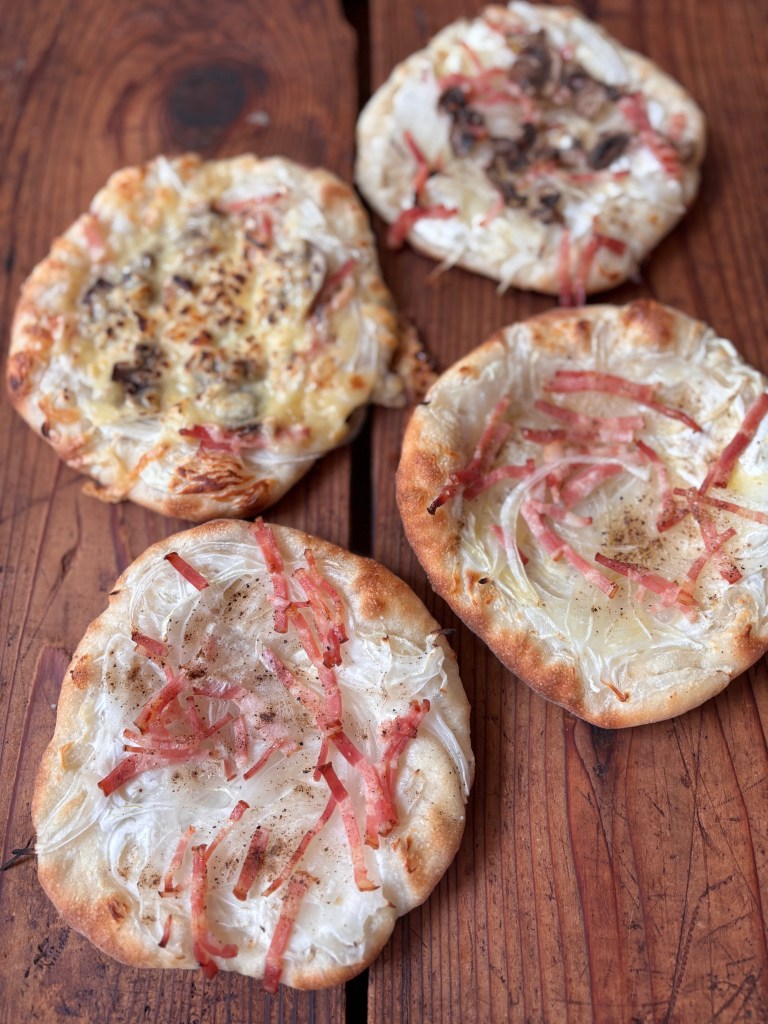 ホシノ丹沢酵母を使い、フランス・アルザス地方の郷土料理の一つ、薄焼きピザを作ります。淡路島産玉ねぎとベーコン、クリームをトッピングした定番のシンプルなものとマッシュルームやチーズをのせたものを予定しています。レッスンでは生地の分割からスタートして、生地作りは動画でご説明いたします。