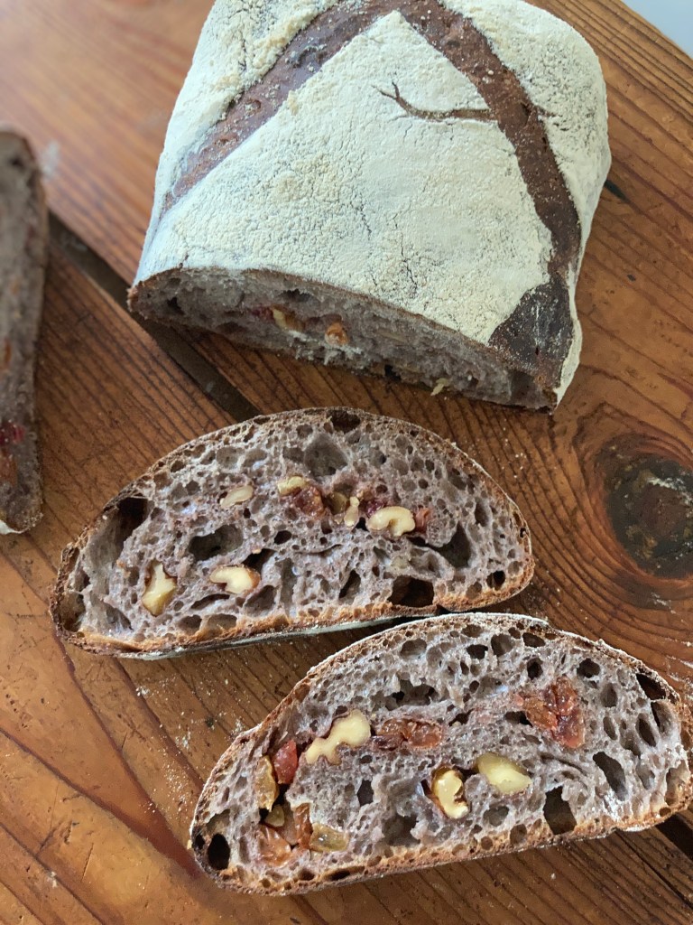 ホシノ丹沢酵母のルヴァン種を作り、水分の多い高加水の生地にレーズンとローストクルミを混ぜ込み、外はバリッと中はしっとりモチモチとした食感のハード系パンを作ります。レッスンでは成型からの作業となり、生地捏ねについては動画でご説明いたします。