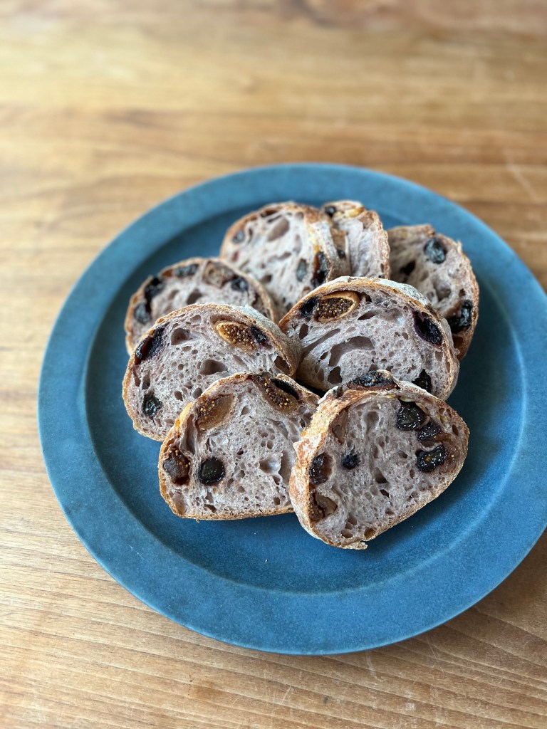 ホシノ丹沢酵母を使い、仕込水に赤ワインを使用して漬け込みフルーツを加えて焼き上げます。残暑厳しい中でも食べたくなるような、フルボディの赤ワインと言うよりかは軽やかでフルーティな感じでクラムも瑞々しく、サングリアをイメージしたパンに仕上げます。レッスンでは分割からの作業となり、生地捏ねについては動画でご説明いたします。
