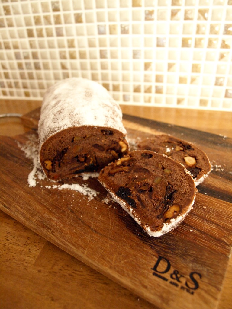 香り高いフランスのカカオバリー社のカカオパウダー入り生地に洋酒漬けフルーツとヘーゼルナッツ、アーモンドのキャラメリゼ、ベルギー産チョコレートをたっぷり入れてしっとりと焼き上げました。北海道産小麦粉、よつ葉バター、天然酵母使用。❶トラディショナルより一回り小さいサイズとなりますが、1本約320gとこちらも具沢山です。